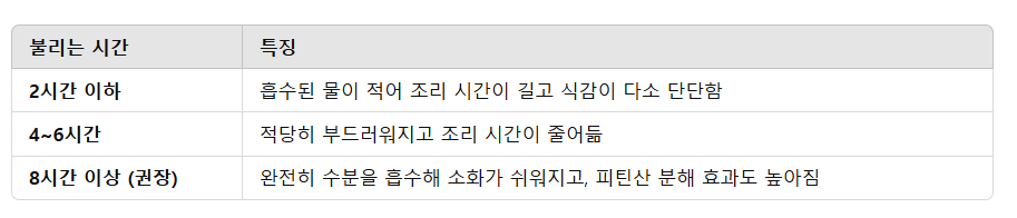 ✅ 빠르게 불리고 싶다면? 따뜻한 물(약 40℃)을 사용하면 3~4시간 만에도 효과적입니다.