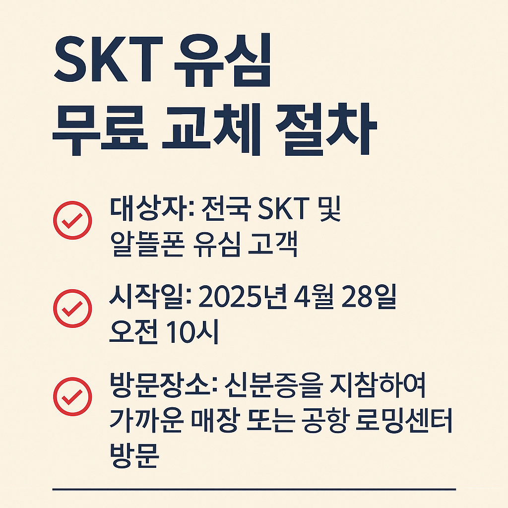 2025년 4월, SKT는 유심 카드에서 발생한 대규모 정보 유출 사고를 공식적으로 인정했습니다. 이에 따라 SKT 사용자와 SKT 망을 사용하는 알뜰폰 사용자 모두에게 유심을 무료로 교체해주는 대대적인 조치를 시행하게 되었습니다. 빠른 대처가 개인 정보 보호에 결정적이기 때문에, 가능한 한 서둘러 신청하는 것이 좋습니다.
